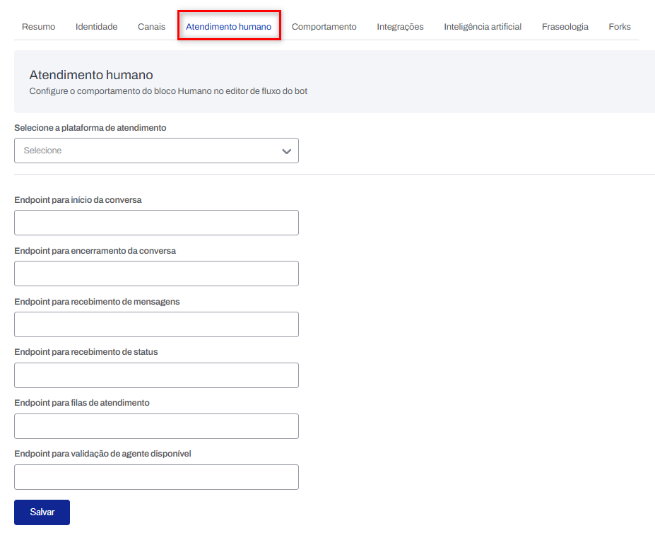 A página “Atendimento humano” permite conectar o Módulo Bots à solução de atendimento que será utilizada para o transbordo para um agente humano.