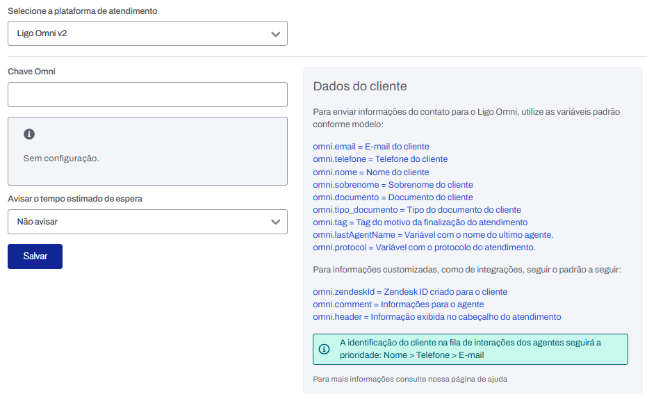 Observe que, ao lado dos campos, são exibidas orientações para auxiliar no envio das informações do cliente para a solução de atendimento selecionada.