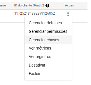 Com a conta de serviço criada, clique nos três pontos ao lado do item criado e selecione "Gerenciar Chaves".